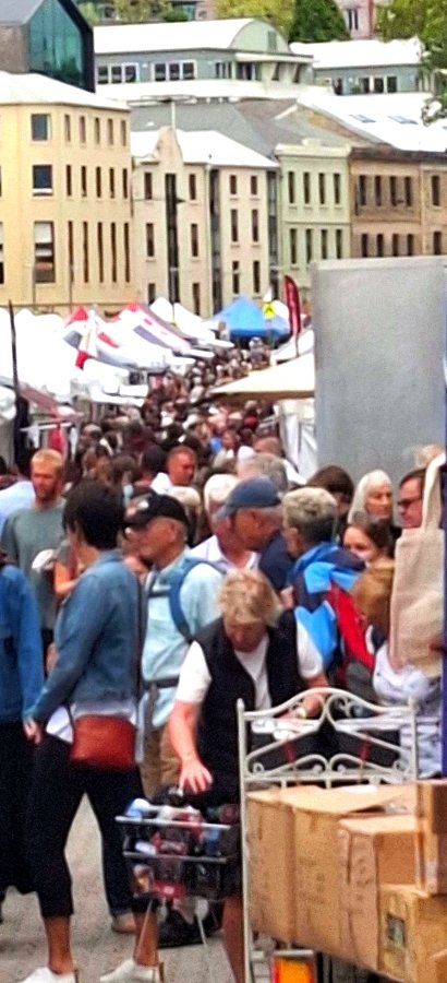 We had to park and walk, but the colonial architecture made the walk worth while. This part of Hobart is steeped in history. The semi-detached houses have been meticulously maintained. Even the stairwell down to the markets was over 200 years old. Four rows of stalls stretched out into the distance. We arrived early and the crowd was building quickly. There was just so much to see. Stall after stall of everything from wooden bow ties to fried scallop sticks, not to omit offerings from various distilleries and organic whatever takes your fancy.