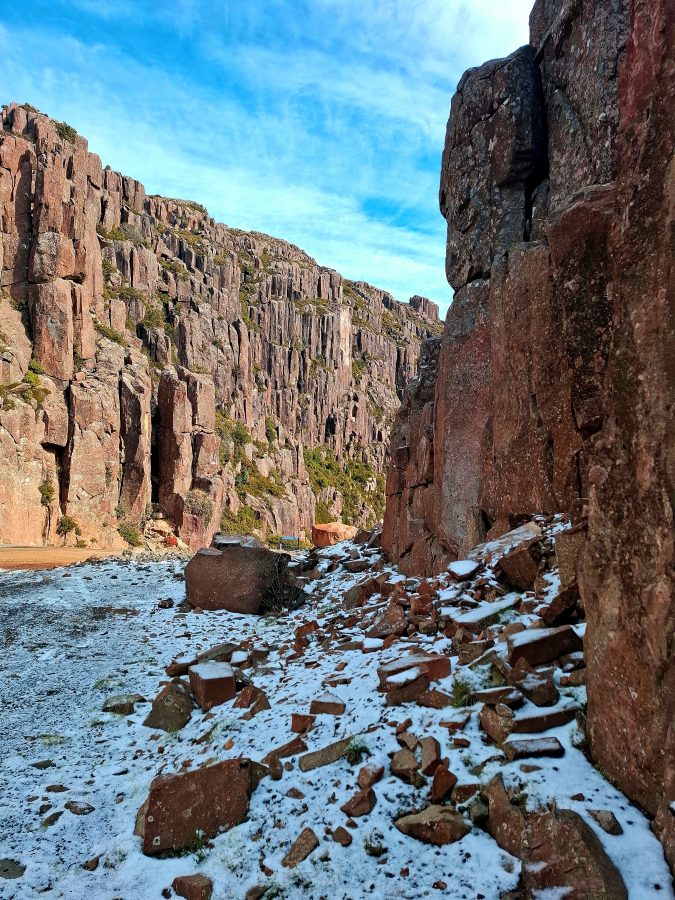 The north-east part of Tassie is pretty remote, so our stay here marked a return to some creature comforts like supermarkets, bakeries and internet. With the temperatures tumbling, the humble meat pie made a triumphant return to the menu. Our plans were vague for the next three days. I think maybe we thought that the adventure was over already. But a quick look at the map revealed Jacobs Ladder and the Ben Lomond plateau was just over an hour away. We’d both seen pictures of Jacobs Ladder but had no idea what to expect. ‘Ladder’ is a metaphor for a tight windy ascent up to the Ben Lomond plateau, that, depending on the weather, can be benign or treacherous.
