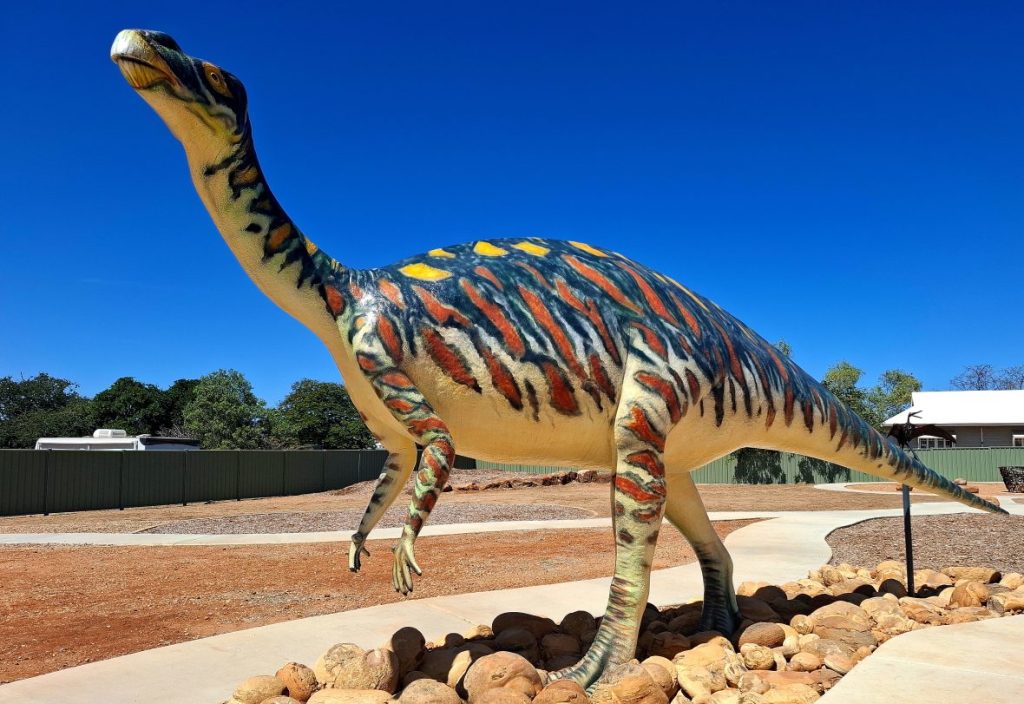 Muttaburra is another dinosaur town, made famous by the accidental discovery, of the now named and famous Muttaburrasaurus. For the full story go to; https://en.wikipedia.org/wiki/Muttaburrasaurus . I went looking for the Muttaburrasaurus Interpretation Centre just to see what time it opened and to my surprise, it’s always open. The full story is set out in static information displays as well as a life size reconstruction. The centre is cleverly designed to keep out the summer heat, subsumed by rocks and earth, with only the morning sun allowed to peek through the ceiling.