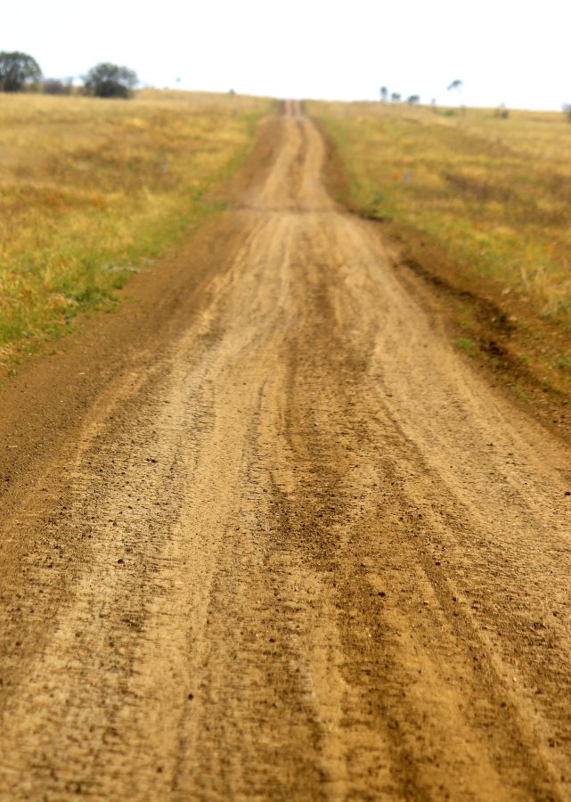 The road conditions were varied, but the dust billowed no matter. My attempts to seal the front door were flapping about wildly and the knot in my stomach was the cleaning job that undoubtedly was in front of me, if or when I made it back to civilization. There were many dips in the road, and a couple of times they jumped up at me and the car and van leapt about. Some of the road traversed black soil country. Black soil and rain is a lethal combination for getting bogged. Why the local Council felt stretches of it needed watering down that day, remains a mystery even now. Pyramids of clodding earth soon talk hold on the front edges of the van and soon she was wearing some kind of pointy bra.