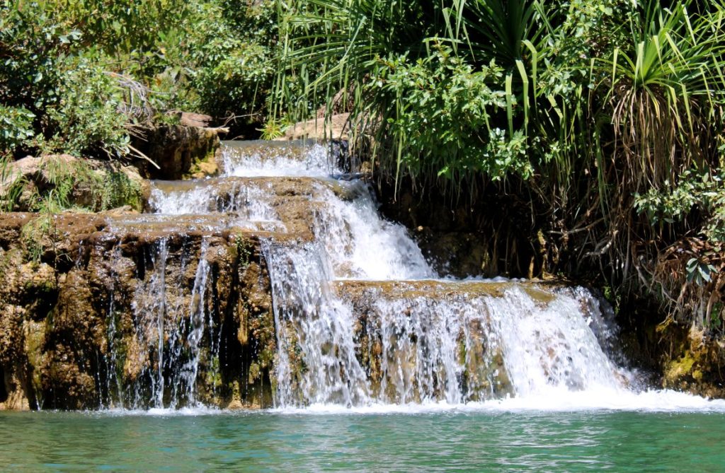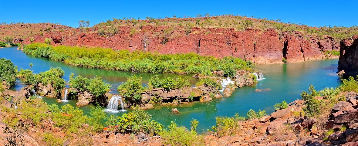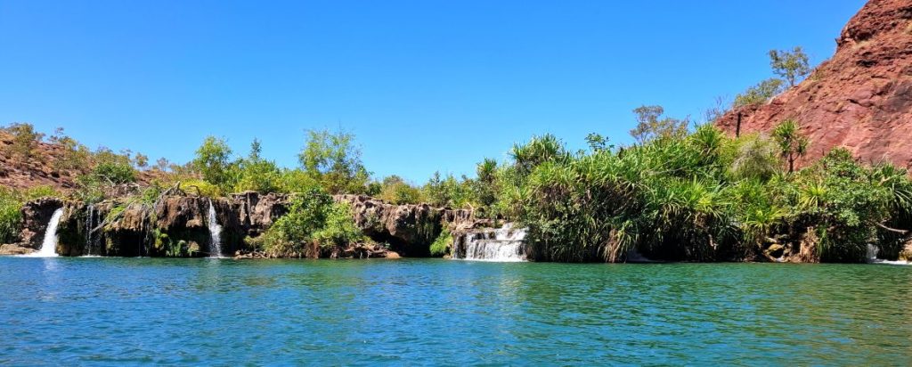 Once we were through the gorge, it was though we had paddled into a scene from Out of Africa The Indarri Falls, a series of cascades off an ancient coral reef, stretched across the river.