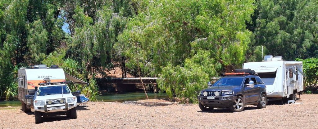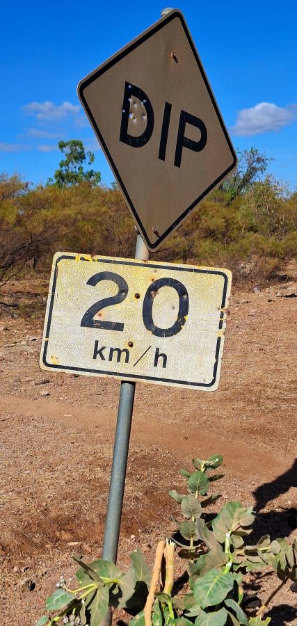 On the way in the previous day, Ken narrowly avoided an (apparently) unsigned washaway that, even with his skill, resulted in the loss of two water tank taps on the van undercarriage and some temporary repairs when we got to Adele Grove. On the way back, we saw it coming and crossed slowly with extreme prejudice. We found that sign. The bottom half was obscured by a bush and the top half was bent around to be unsighted by oncoming traffic. I did what I could, but a hammer would have been handy. That little excitement aside, the run back to Gregory was uneventful and we were looking forward to spending the next three days wrinkling up in the cool clear waters, only emerging for a beer and a sanga(and of course, the footy).