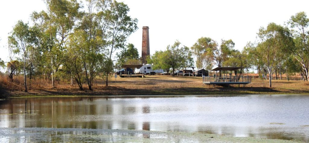 A cool breeze blew in later that night and we were up early. We had toyed with the idea of doing the Undara lava tubes, but at $120 a throw….well, we let that one go through to the keeper. What we DID do was spend a night at an old gold mine called the Cumberland mine. Only a solitary chimney remains, but a small dam, built during those heady days, was enough to pull us off the road.