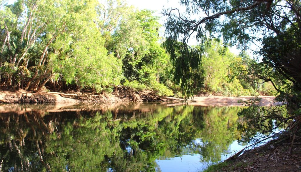 Now ostensibly, our only stop was going to be back at Old Lara Station, to see if the mangoes were any riper. The road was in good condition and we had gone almost 50klms before the first cloud of dust in the distance, the start of a conga line of cars with boats. We had decided to maybe explore a couple of lagoons on the way out, but all the access roads were blocked. Then Ken spotted a sign, Kennedy Bend, through the trees and suggested we pull over to take a quick look.
