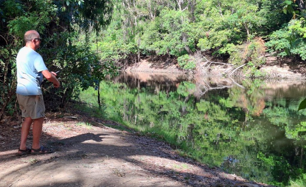 Now, I should have paid more attention to the memorial plaque nailed to a nearby tree, but we had seen lagoons before and I assumed we’d be back on the road in a couple of minutes. However Ken’s eyes lit up at all the ‘activity’ in the water. This could be his last chance to catch a ‘barra’, and he rushed back to the car to grab a rod and his rucksack, which had (almost) everything – but more about that in a minute.