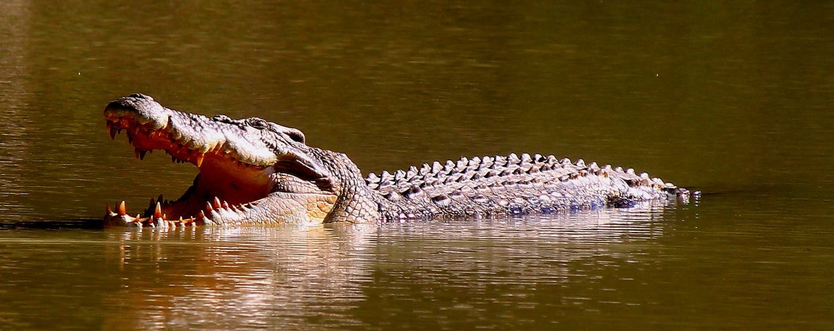 Now, you’d think that’s a happy ending, right. But noooo, Ken the ex- fisheries inspector, had to make sure it was big enough to keep….exactly sure (and no surprise to anyone who knows him). This is where the unseen terror commences. Now, for a reason that even to this day defies logic, he did not carry a tape measure in the fishing rucksack, which, packed to the gunnels, had absolutely everything else. “It’s somewhere back up at the van”, he said. “I’ll be back in a minute”, he said. So, I was delegated to hold the rod and keep my foot on the fish’s head till his return. Now, I was left standing there with my back to the water. Unbeknowns to me, under a rocky overhang, literally underneath my feet, lurked a 4 metre croc, who upon hearing all this movement and conversation had emerged to see what was for breakfast.